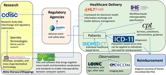 Exemplar relationships between select terminologies, data standards, and resources. The spheres of activity are designated by coloured boxes where yellow is research, grey is meta thesauri and mappings, light orange is regulatory activities, green is healthcare delivery (slightly darker for a sub-box of observations), and blue is reimbursement. The mappings are simplified and do not indicate the many levels of interactivity and potential interoperability.