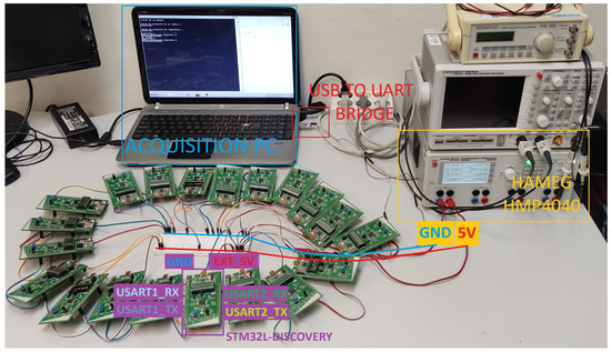 Moreover, additional elements are incorporated for the implementation of the acquisition chain topology. A key component is the acquisition PC, responsible for the initialization and randomization (if necessary) of the experiment’s execution order, as well as for managing its execution. Additionally, it is responsible for properly collecting and indexing the data transmitted through the serial port. To physically enable communication between the nodes and the host PC, a USB to UART Bridge Virtual COM Port (VCP) bongle based on the CP2102 circuit is used. Furthermore, a ROHDE & SCHWARZ® HAMEG HMP4040 programmable high-precision power supply with four channels of 0/32V–0/10A is employed for acquisitions 1, 2, and 3 (named ACQ1, ACQ2, and ACQ3, respectively). This power supply is utilized to ensure proper power supply to the devices under study and to minimize the effects of the disturbances typically present. For acquisitions ACQ4 and ACQ5, the Gold Source® DF1731SB and HANMATEK® HM305 sources were employed, respectively. The specific objectives include, in the case of ACQ4, obtaining samples from the boards with a different power supply, thereby enabling the study of their impact on the robustness of identification schemes. Lastly, the purpose of the ACQ5 acquisition is to enhance the variability of the dataset obtained from devices powered by a low-budget source, extending the exploration of its implications. Utilizing these three different power supply scenarios established a solid foundation to serve as a reference point for the study of the technique. Throughout the utilization of the platform in these experiments, an average power demand of approximately 5.067 W was observed. This translates to roughly 253 mW per node, a value also noted during the individual experiments.