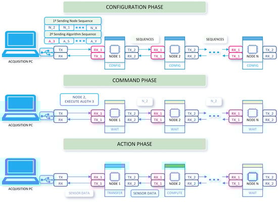 As shown in Figure 2, during the initial configuration phase, each node receives two arrays with the sequences that will define the current experiment (i.e., a first sequence for the order of the nodes and second one for the order of the algorithms) and passes them on to the next node, subtracting the corresponding position in the chain and the order in which it will be called. Once all nodes have been configured, they enter into a waiting state, marking the beginning of the command phase, where they wait for the message from the acquisition PC with the position of the node that should execute the first algorithm in the sequence. This instruction travels from node to node until it reaches the desired position, promoting the action phase along the way. If the receiving node matches the specified node in the instruction, it will compute the specified algorithm, sample the sensors during the process, and send these readings along with other previous metadata to the host PC (details in Table 1). Otherwise, its role is to transmit all the received information to the next node towards the acquisition computer, acting as a bridge. Once all the samples for an algorithm execution have been collected and a end-of-transmission frame has been sent, the nodes that were in the action phase recognize it and return to the command phase, awaiting for new commands. This process is iterated for the configured number of repetitions, continuing with the remaining nodes in the sequence until all the algorithms have been computed according to the established order.
