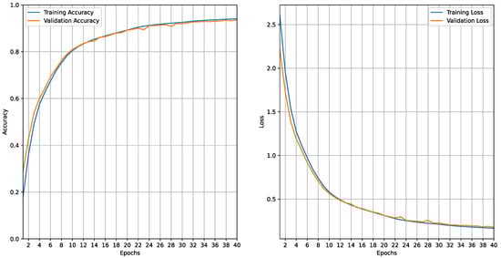 Figure 3 illustrates the evolution of the training and validation accuracy and loss error throughout the epochs. Subsequently, the model’s performance was assessed against the test subset (Figure 4 and Figure 5), achieving an average accuracy of 93.71%. These results highlight the robustness of the preliminary model and validate the data collection process.