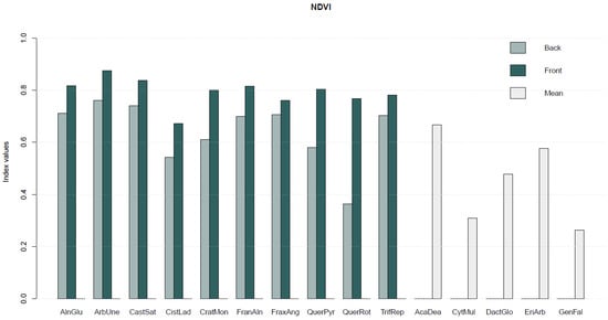 - Normalised Difference Vegetation Index (NDVI): sensitive to biomass, quantity, and condition of vegetation. NDVI values range from −1 to 1. Surfaces containing clouds or water result in an NDVI less than 0, while values close to 1 indicate healthier vegetation. This range also encompasses other landscape components (such as roads and construction) and highlights vegetation in the process of senescence [38]. The NDVI is calculated according to the Equation (1):where R800 represents the reflectance at 800 nm and R680 represents the reflectance at 680 nm, in the NIR and red domains, respectively.NDVI = (R800 − R680)/(R800 + R680)