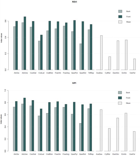 - Structure Insensitive Pigment Index (SIPI): maximises the ratio between carotenoid and chlorophyll pigments, indicating an elevation in vegetation stress in high values [43]. The SIPI is calculated according to the Equation (5):where R800 represents the reflectance at 800 nm, R445 represents the reflectance at 445 nm and R680 represents the reflectance at 680 nm.SIPI = (R800 − R445)/(R800 + R680)