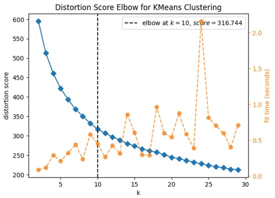 Elbow method for a maximum of 30 clusters using the K-Means algorithm.