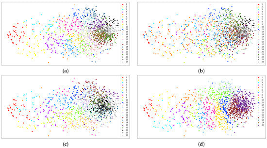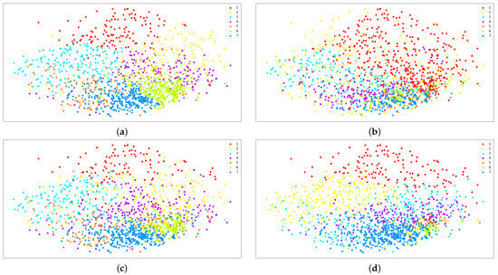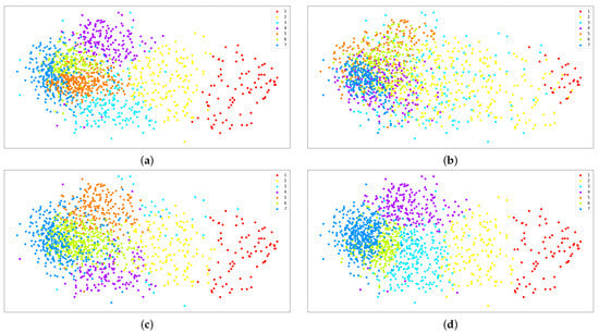 Visualization for seven clusters without weights. (a) K-Means, (b) GMM, (c) Agglomerative, and (d) Fuzzy C-Means.