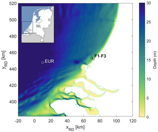 Frequency-direction surface elevation spectra () were calculated with the Maximum Entropy Method [23] per 1 h burst, using , and as input. Hereto, and were used that were measured 10.2 m (F1), 6.0 m (F2) and 2.0 m (F3) from the bottom. Additional frequency-directional surface elevation spectra () were calculated for F1 and F2 using instead of . First, time series were flagged using , and . Gaps related to and were linearly interpolated if they were smaller than 1 s and filled with a 1 s moving average of the raw data if they were larger than 1 s. Then, spectra were calculated by dividing quadratically detrended 1 h time series into blocks of 256 s, using 50% overlap and tapering each block with a Hamming window. This resulted in 68 effective degrees of freedom. To obtain , a transfer function based on linear wave theory was applied to convert the pressure spectrum into an elevation spectrum.