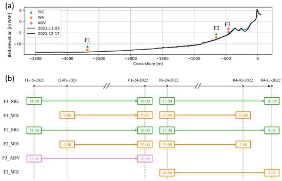 (a) Bed elevation profile with location of measurement frames, (b) timeline indicating data collection periods of the different instruments. No velocity data were recorded at frame 3 after 21 February 2022.