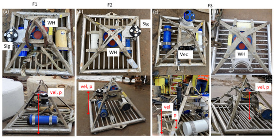 (a) Frame 1 with Signature (SIG) and Workhorse (WH) ADCPs, (b) Frame 2 with SIG and WH ADCPs, (c) Frame 3 Vector ADV deployed from 15 November 2021 to 24 January 2022, and (d) Frame 3 with WH ADCP deployed 24 January 2022–13 April 2022. Red arrows indicate velocity (vel) and pressure (p) sensor heights from the bottom as indicated in Table 2.