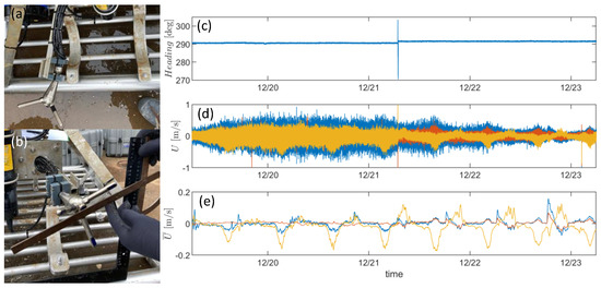 (a,b) The cantilever bent and the ADV velocity probe moved out of position, (c) heading measured in the housing of the ADV, (d) instantaneous X (blue), Y (red) and Z (yellow) velocity in the ADV coordinate system, and (e) corresponding 10-minute averaged velocity.