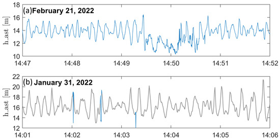 Inspection of the acoustic surface tracking signal () showed the need for quality control. Intermittently, dropped unrealistically by a few meters for seconds to minutes (Figure 5a), which contaminated the low-frequency signal. The drop in the water level was observed more frequently during storms, although it was not limited to such conditions. Possibly, the water level drop was related to the reflection of the altimeter signal on bubbles just below the surface caused by wave breaking. A two-step quality control routine was designed to prepare the data for further analysis. Poor quality data were identified and flagged (). First, bursts with water level drops were identified by calculating the standard deviation, , per 1 h burst