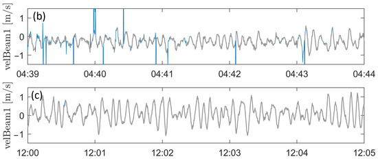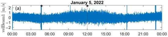 Velocities along Beam 1 10.2 m from the bottom for the Signature ADCP at frame 1 (F1) on 5 January 2022. (a) Raw velocity during the entire day showing the semi-regular occurrence of periods with pronounced spikes. (b,c) Zoom of two 5 min subsets with raw (blue) and despiked (gray) time series. Flagged data points were set to NaNs and no interpolation was performed. Asterisks in (a) indicate the selected 5 min subsets.