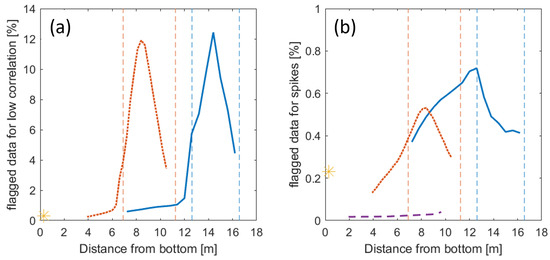 In addition, inspection of the velocity signals revealed the need for quality control as spikes appeared at a semi-regular interval at both F1 and F2 (Figure 6a). First, data were flagged if < 50% (following [17]) for at least one of the beams. Cells closer to the surface were flagged more often as decreased with distance from the sensor (Figure 7a). This resulted in flagging up to 12% for both F1 and F2 close to the water surface (14 m and 8 m from the bottom, respectively). Second, data were flagged if spikes were detected in one of the beams, resulting in flagging an additional 0.7% of the data for F1 at 13 m from the bottom and 0.5% for F2 at 8 m from the bottom (Figure 6b and Figure 7b). Flagged data were stored in (Table 5), which was added to the netcdf file. Note that we created only a single for all four beams, with the reasoning that poor quality data in even a single beam can translate into poor quality analysis outcomes when using all four beams as input.