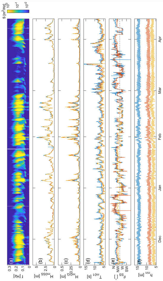 Subsequently, bulk parameters were obtained for each 1 h burst by integrating the frequency-direction spectra over direction, bandpass filtering on SS (0.04–0.33 Hz) and IG (0.004–0.04 Hz) frequencies, and calculating the respective 0, 1st and 2nd order spectral moments (, , ). SS wave parameters were calculated from , which is based on direct measurements of the sea surface () and thus captured better energy in high frequencies than . Instead, IG wave parameters were calculated from , because the low-frequency part of was found sensitive to the observed water level drops in (Figure 5a; see also Section 6). Significant wave heights were estimated as and , whereas mean wave periods were calculated as and . Peak SS wave period () and peak SS wave direction () were calculated from the respective peaks in the direction-integrated and frequency-integrated spectra.