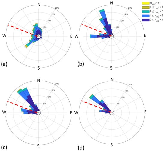 Wave roses during the 5-month study period at (a) Europlatform, (b) F1, (c) F2, and (d) F3. The dashed horizontal red lines indicate the shore-normal direction corresponding to the local coastline orientation (295° N).