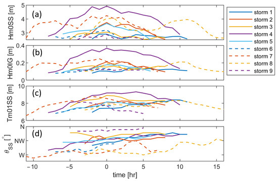 (a) Sea-swell significant wave height , (b) infragravity significant wave height , (c) mean wave period , and (d) sea-swell mean wave direction during the nine storms. Time is set to 0 h at the peak in of each storm.