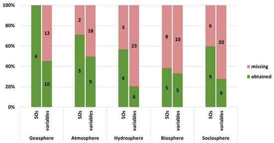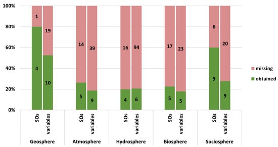A large amount and variability of data have been collected so far. Figure 4 shows how many SOs and their related variables are already covered in the Gesäuse-Johnsbachtal site considering, all system strata and site categories. In our analysis, the criterion for a SO to be considered as obtained is that at least one of its variables is measured. We can see, that Geosphere and Sociosphere are currently well covered (in terms of SOs > 50%), while the other three strata show coverages of only about 25%. The covered strata are more or less in line with previous assessments done for all other eLTER sites []. Although, [] used components instead of the currently used strata, there is still a large similarity in what is measured elsewhere compared to our site (see Figure 3 of []). In their component water budget, for example, discharge has been measured in 24% of the sites. For their component abiotic heterogeneity, (in essence weather data, air temperature, windspeed and soil characterization) more than half of the sites had measurements (61% for air temperature, 60% for wind speed and 51% for soil). These are equivalent to our atmospheric and geospheric variables. However, since the focus of the Gesäuse-Johnsbachtal site lies on the habitat of inland surface running waters and forest targeting the eLTER category 2 standards, the number of required SOs and variables has been reduced (see Figure 5). This results in a coverage of more than 50% for the required SOs besides the Biosphere. Nevertheless, less than 50% of the SO variables are measured.