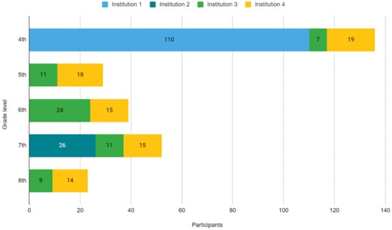 Lastly, Figure 1 illustrates the distribution of participants by school and grade level. Most institutions had only one section per class, except for Institution 1, which had four sections of the same level (fourth grade).