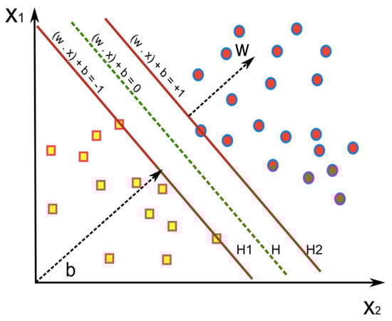 A maximum margin classifier can be used for classification as long as a separation hyperplane exists. However, in many cases, such a hyperplane does not exist, so we would not have a maximum margin classifier. In this case, the optimisation problem proposed in Equation (6) has no solution with []. In the above case of linear SVM for separable cases, we assume that error-free decision limits are constructed. The formulation of the method can be modified so that it learns a decision boundary that is tolerable to small errors in the training observations (Figure 2). To achieve this goal, a method known as the soft margin approach is used []. In this way, it is possible to construct a linear decision boundary when classes are not linearly separable.
