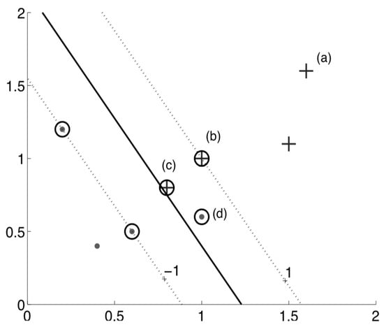 Error-tolerant soft margin hyperplane. When an instance is classified, four possible cases may appear: (a) indicates that the instance is on the correct side and away from the margin; (b) indicates that the instance is on the correct side and on the margin; (c) indicates that the instance is on the correct side but away from the margin. Finally, (d) indicates that the instance is on the wrong side: it is a misclassification [].