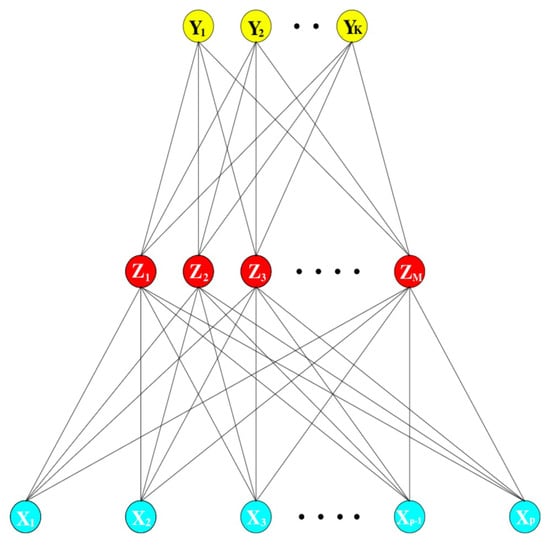 Schematic representation of an ANN with a single hidden layer. The blue nodes represent the input variables (input layer), the red nodes represent the hidden layer, and the yellow nodes represent the output variables (output layer) []. In this shallow network, with a single hidden layer, the inputs to the artificial neurons in the output layer are not the original variables. Hence, this fully connected network maps the input variables in a p–dimensional space to an M–dimensional space, where there might exist a hyperplane decision boundary to classify the input vectors. Thus, ANNs are known as universal approximators, where the output layers calculate their predictions based on a new representation of the original input variables obtained in the hidden layers.