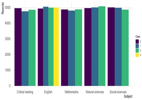 The data used for this research were provided by ICFES []. The information provided corresponds to Córdoba during the second semester of 2017. The data contained 80 predictors related to different characteristics: personal, socioeconomic and school. The variables with personal information about the students are briefly described in Table 1, the socioeconomic variables are described in Table 2 and the school-related variables are briefly described in Table 3. In addition, the data contained information on 5 subjects evaluated in the exam (target variables), such as critical reading, mathematics, social sciences, natural sciences and English. The level of academic performance is classified taking into account the score obtained in each subject (see Table 4). The data set is relatively balanced in terms of these classes, as illustrated in Figure 4. The bar chart in this figure shows that the number of records is nearly equal across all performance classes.