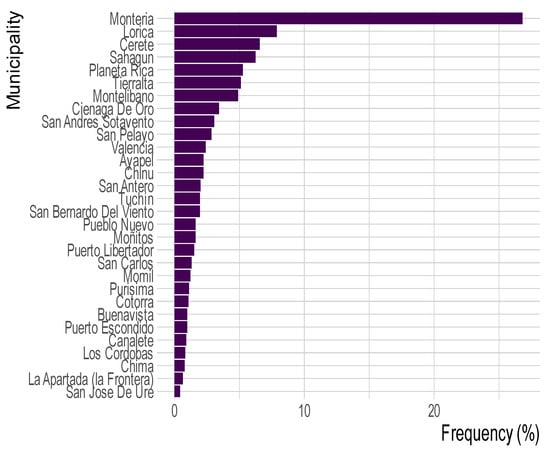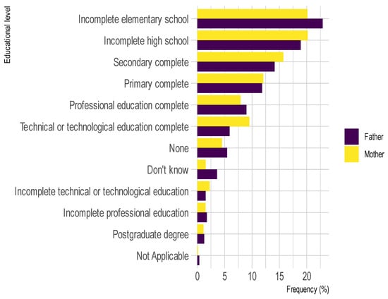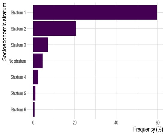 The average age of the students was 18 years with a standard deviation (SD) of 1.8. The average socioeconomic index among the students was 45.6 with a SD of 9.0. The most common type of document was the identity card with 86.5%, followed by citizenship card with 10.8% and 2.7% for civil registration. Regarding gender, 54.3% were women and 45.7% were men. The distribution of ethnicity in the students was: Zen with 9.9%, Afrodescendant with 2.4%, Embera 0.12%, Raizal 0.04%, Way 0.035%, Arhuaco 0.005% and another ethnic group 0.44%. Eighty-seven percent of the students did not belong to any minority ethnic group. The most common municipality of residence was Monteria with 26.8%, followed by Lorica with 7.8% (see Figure 5). This is due to Montería being the capital city of the Córdoba department. The frequencies for all the municipalities of Córdoba are shown in Figure 5. The highest educational levels for both fathers and mothers were incomplete primary and complete secondary school. The frequency percentages for these two factors can be seen in Figure 6. The most common type of work for fathers was farmer or day labourer, with 23.1%. Among mothers, the most common job was housewife, with 58.6%. The most frequent stratum was stratum 1 with 60.0%, followed by stratum 2 with 20.5%, stratum 3 with 7.1% and no stratum with 4.5% (see Figure 7).