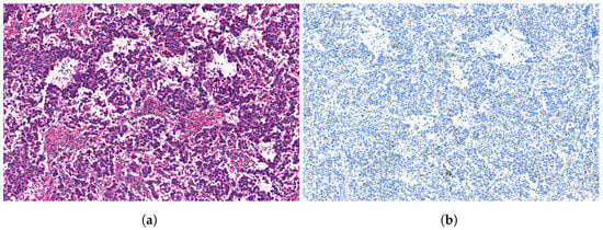 In [], the authors addressed the problem of determining the number of Ki67-positive cells from HE images for the treatment of several cancer types. The ResNet model was trained to differentiate between negative and positive cells in homogeneous regions, effectively classifying tissues as having either 0% or 100% positivity. In contrast, we aim to train the model to classify tissues into various positivity ratio intervals. This approach involves analyzing patches that encompass heterogeneous tissue regions containing both positive and negative cells. In seminomas, the Ki67 index typically exceeds 50%, although values below 20% have also been observed []. Notably, a high proliferation index in seminomas does not show a clear correlation with the clinical stage or the presence of distant metastases []. However, a specific study identified a significant inverse relationship between Ki67 expression exceeding 50% and rete testis invasion []. To facilitate machine learning on 77 pairs of HE- and Ki67-stained slides containing testicular seminoma samples, we established three categories for Ki67 expression: below 20%, 20–50%, and above 50%. The method employed for obtaining Ki67 annotations for HE patches is described in more detail in []. Applying clustering, the Ki67 scans were recolored into three dominant colors: brown, blue, and white. Then, the Ki67 positivity ratio was estimated from the number of pixels belonging to the colors mentioned above. In [], we employed the presented dataset to train the ResNet18 model on both binary and multiclassification tasks. To evaluate the model performance, we divided the dataset into a training set and validation set, which comprised 10% of the extracted patches from the training set, allowing us to monitor training progress and validate the model on previously unseen data originating from tissues familiar to the model. The model achieved good performance in classifying HE patches into Ki67 index categories on both binary tasks and multiclass tasks with an accuracy of 0.775 and 0.789, respectively.