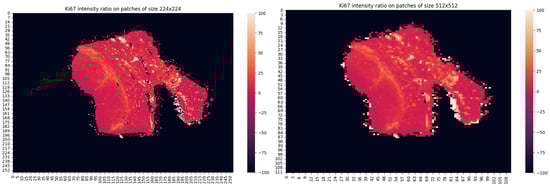 To validate this assumption, patches measuring and pixels were generated, the Ki67-positivity ratio was quantified in accordance with [], and all patches from the image were visualized in a heatmap, colored based on the degree of Ki67 positivity, as shown in Figure 2. Due to the low Ki67 positivity of tissue patches, negative values were assigned to patches without tissue to distinctly differentiate the tissue-containing areas from the background.