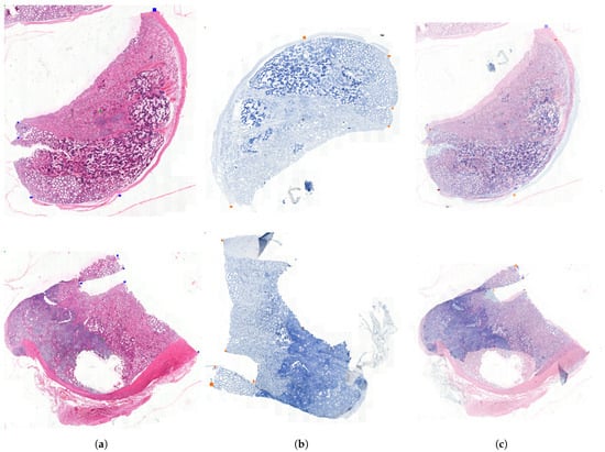 Hematoxylin–eosin (HE) staining, as shown in Figure 1a, is widely used as a universal basic tissue stain. It is the first step in evaluating various cancer types and is extensively used for primary diagnosis due to its simplicity and cost-effectiveness. HE staining provides basic morphological information, such as the shape of cells and tissues. In clinical practice, immunohistochemical (IHC) staining, illustrated in Figure 1b, is frequently employed to obtain the protein expression status for diagnosis confirmation and subtyping. IHC staining visualizes the expression of various proteins (e.g., Ki67, estrogen receptor) on the cell membrane or nucleus. It is often necessary to perform several different IHC stains to conduct a differential diagnosis and determine attributes such as histogenesis, molecular subtype, or proliferation rate.