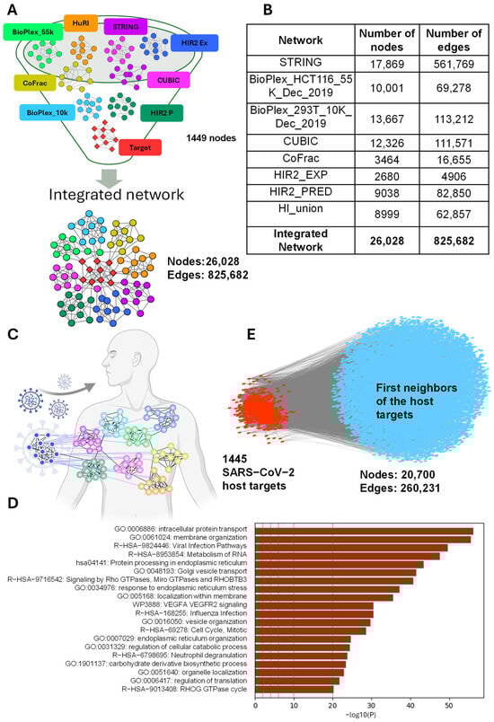 (A) Integration of multiple protein interaction networks to identify a consensus target cluster. This figure illustrates a funnel-like integration strategy, where distinct protein interaction networks from various databases are combined. Each colored cluster represents a unique network. These networks converge to identify a consensus ‘target’ set, denoted in red. (B) Details of the numbers of nodes and interactions for a particular network. BioPlex 55k, HuRI, STRING, HIR2 Ex, CUBIC, CoFrac, BioPlex 10k, and HIR2 P. (C) Schematic to display SARS-CoV-2 open-reading frames (ORFs) targeting the human interactome. (D) Analysis of the functional enrichment of CentralityCosDist prioritized genes using the Metascape web application. (E) Integrated or merged human PPI (blue) network and target proteins (red).