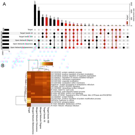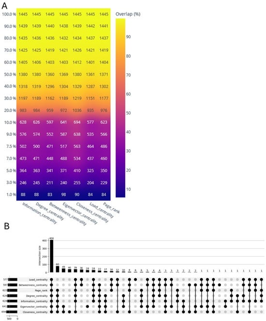 (A) Centrality measure and target protein overlap in the human–SARS-CoV-2 interactome. This heatmap visualizes the overlap of the target protein nodes based on different centrality measures within an open network. The x-axis lists various centrality metrics, such as degree, betweenness, eigenvector, closeness, local, and PageRank centralities. The y-axis represents the percentage of the nodes within the network, ranging from the top 1% to 100%. Each cell contains a numerical value indicating the number of nodes that are target proteins across the different centrality measures, with the corresponding color gradient reflecting the degree of the overlap—ranging from low (blue) to high (yellow). The high degree of the overlap is indicated by the consistent appearance of higher values (indicated by yellower shades) at the top percentage, particularly in the top 10%. (B) UpSet plot of 10% open network’s target centrality overlap. Overlap of top 10% (centrality-ranked nodes) target proteins’ overlapping nodes.