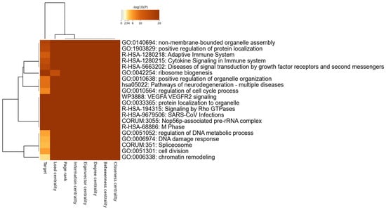 In a previous study, four different centrality measures (degree, betweenness, closeness, and eigenvector) were employed on 332 SARS-CoV-2 host targets []. That study concluded that all the centrality measures play a significant role in identifying crucial nodes within a network. As a result, median ranking scores were calculated, and the top 20 candidates were selected for functional similarity analysis. This analysis informed the construction of a drug–protein interaction network []. Similarly, in our previous study, network centrality analyses utilizing seven different centrality metrics identified 28 high-value SARS-CoV-2 targets. These targets are likely involved in crucial processes, such as viral entry, proliferation, and survival, contributing to the establishment of the infection and the progression of the disease []. In the present study, we identified 406 nodes that are common across seven different centrality measures. Additionally, we found 66 and 113 nodes that are common across six and five centrality measures, respectively. This indicates a robust convergence of nodes across multiple centrality metrics, highlighting their potential significance in the network and potential therapeutic targets. Organelle assembly, protein localization, adaptive immune response, cytokine signaling, diseases of signal transduction, ribosome biogenesis, and neurodegeneration pathways emerge as prominent biological pathways enriched across centrality measures (Figure 3). Taken together, we discovered that centrality measures, particularly the closeness centrality, high-eigenvector centrality, and information centrality nodes, as well as hubs and bottlenecks, are effective metrics to identify SARS-CoV-2 host targets.