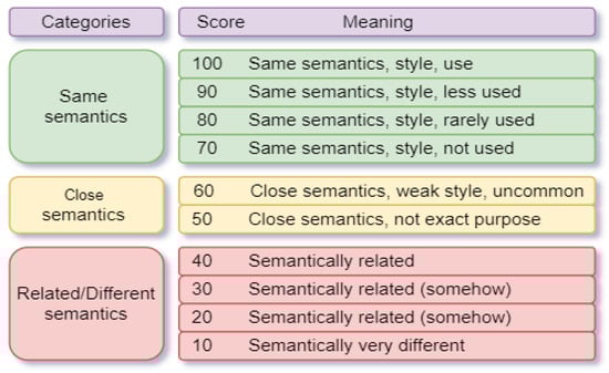 Figure 1, are fuzzy scales from 0 to 100, representing the strength of the synonymy relation. The strength is 100, which means the same semantics, style, and use. The scoring schema has three categories: a score from 60 to 100 means that the substitutes have the same meaning, a score from 50 to 60 is close in meaning, and below 50 means different semantics.