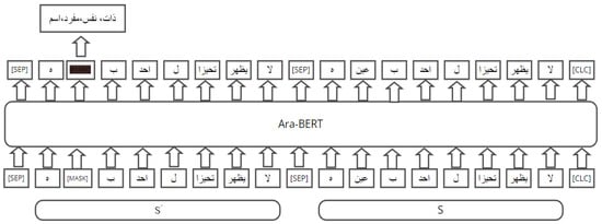 The language modeling feature is a ranking feature (BERT loss) used to evaluate the fluency of substitutes for each sentence in our dataset. The AraBERT is used to calculate the sentence probability. AraBERT is an MLM, so we cannot estimate the sentence probability directly by AraBERT. Let w be the target word and W = w−n…w−1, w, w1…,wn, be the target word w context. The sentence probability is calculated by replacing the target word w with each substitution candidate set. Then, mask one word of W in the sentence around the target word position from back and front, then feed it into AraBERT to calculate the cross-entropy loss of the masked word. This step is repeated for each word in the sentence. The substitute candidates will be ranked based on the average loss of W. The lower loss is a good substitute for the original target word. A context with a symmetric window size equal to five is used around the target words.