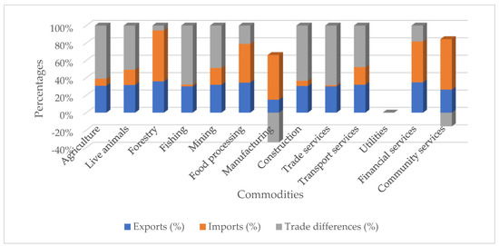 Figure 1 presents the share of the commodities exported or imported. The trade service sector had the largest share (42%) of commodities exported to the rest of the world, followed by the manufacturing sector with about 20%, mining (19%), transport services (9%), and food processing (3%). Agriculture exported only 2% of their commodities to other countries. In the case of imported commodities, about 68% of commodities were imported by manufacturing sectors, followed by mining with approximately 11%, financial and community services (11%), food processing (3%), and agriculture (1%).