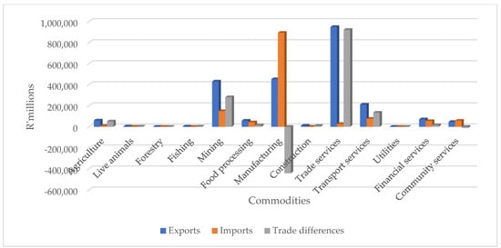 The trade sector had the highest share (42%) of commodities exported to the rest of the world, whereas agriculture exported only 20% of its commodities to other countries. The manufacturing and community service sectors had a trade deficit of ZAR 440 million and ZAR 11 million, respectively. In contrast, other sectors (such as agriculture, mining, food processing, construction, trade services, transport services, and financial services) within the economy experienced a trade surplus.