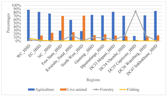 Figure 3 presents the shares of household consumption by region. Over 70% of the agricultural commodities are consumed by five provinces (Western Cape (88%), Eastern Cape (82%), Northern Cape (77%), Gauteng (73%), and Mpumalanga (72%)). Regarding household consumption by live animals, North West and Free State households consumed about 71% and 70%, respectively. The least of the household consumption comes from forestry and fishing. Looking at the district level, Mopani and Sekhukhune consumed over 80% of the agriculture commodities, whereas Vhembe and Waterberg consumed about 70%. Capricorn households consumed approximately 83% of forestry, while the remainder comes from agriculture with 14% and live animals with about 3%.