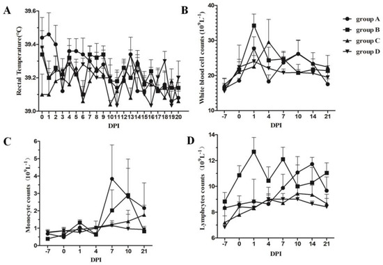 To judge the different clinical presentations among the four groups, the clinical course was monitored during the experiment. Rectal temperature was recorded every day in the morning from 0 to 20 DPI (Figure 1A), and no piglets exhibited fever in any of the four groups. Two piglets in group D (control group) displayed severe lethargy, anorexia, and emaciation due to bacterial infection and were humanely euthanized at seven and ten DPI, respectively. The other piglets in the four groups showed no clinical signs during the experiment.