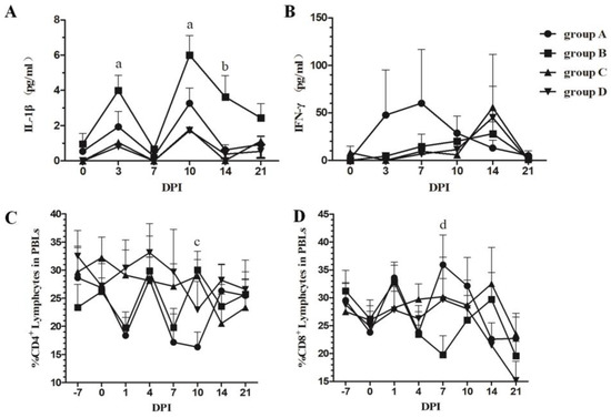 Concentrations of serum IL-1β and IFN-γ and changes in the percentage of T lymphocyte subsets in PBLs. Serum concentrations of IL-1β (A) and IFN-γ (B) were measured using commercial ELISA kits (Cusabio, China); Changes in the T lymphocyte subset in PBLs for CD4 (C) and CD8 (D) expression were detected by flow cytometry. Each point represents the mean value (±S.D) generated from each group on different DPIs. a, group B is higher significantly than groups C and D (p < 0.05); b, group B is higher significantly than groups A and C (p < 0.05); c, group A is lower significantly than groups B and C (p < 0.05); d, group A is higher significantly than group B (p < 0.05).