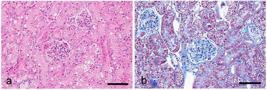 Histological findings of the cortex in the feline kidney. (a) HE stain, (b) MT stain. Scale bars 100 μm.