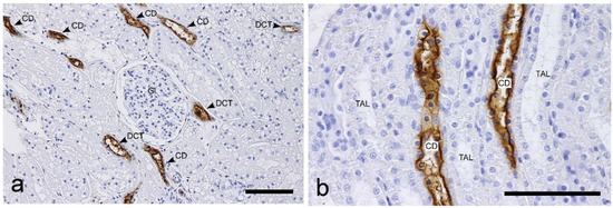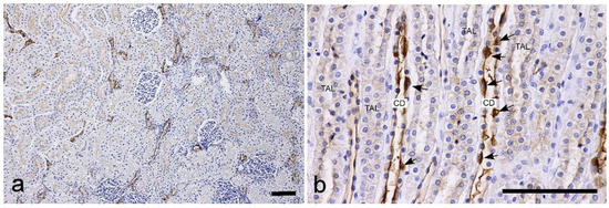 SBA: No labeling was observed in the glomeruli or PTs. In the loops of Henle, the TLs showed strong labeling (Figure 7a), while the TALs showed negative or faint labeling. The CDs also exhibited negative or faint labeling.