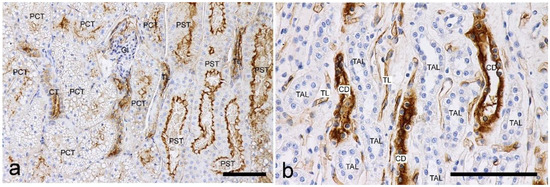 RCA-I: Clear labeling was observed at the brush borders of the PTs, and the labeling intensity was stronger in the PSTs than in the PCTs (Figure 4). Strong labeling was also observed in the TLs and CDs; however, the TALs of the loops of Henle were negative.