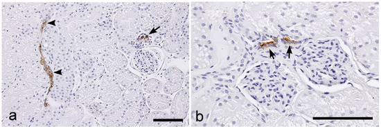 Histochemical staining for Soybean agglutinin (SBA) and Dolichos biflorus agglutinin (DBA) in the feline kidney. (a) SBA: inner medulla. Positive labeling can be observed in the thin limbs of the loops of Henle. (b) DBA: superficial area of the cortex. Positive labeling can be regionally observed in the vascular endothelium of a capsular vein (arrow). Scale bars: 100 μm.