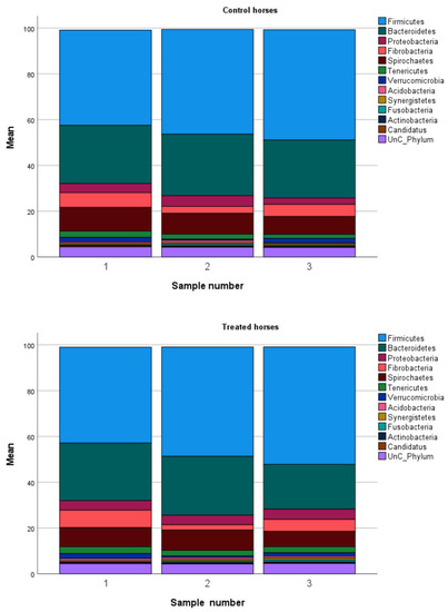 - Shepherd, M.L.; Swecker, W.S., Jr.; Jensen, R.V.; Ponder, M.A. Characterization of the fecal bacteria communities of forage-fed horses by pyrosequencing of 16S rRNA V4 gene amplicons. FEMS Microbiol. Lett. 2012, 326, 62–68. [Google Scholar] [CrossRef] [PubMed]