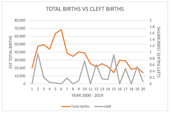 - McLeod, N.M.H.; Arana-Urioste, M.L.; Saeed, N.R. Birth prevalence of cleft lip and palate in Sucre, Bolivia. Cleft Palate-Craniofacial J. 2004, 41, 195–198. [Google Scholar] [CrossRef] [PubMed]
