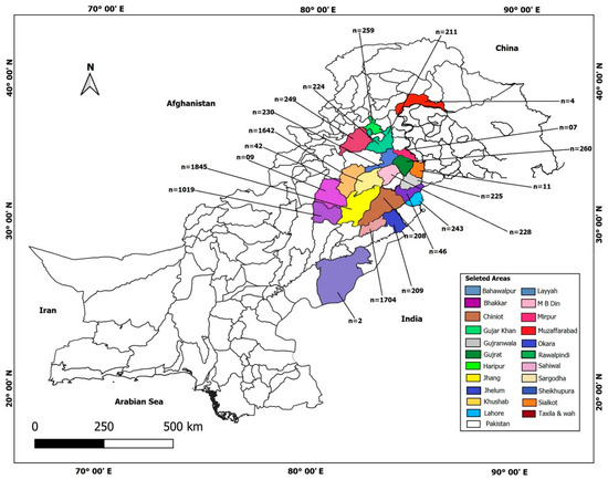 Map of Pakistan depicting distribution of animals examined (n is number of animals examined per district).