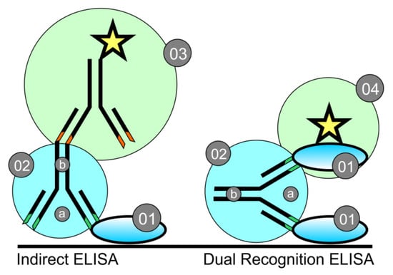 Schematic comparison between indirect ELISA (left) and dual recognition ELISA (right) (inspired by []). 01—fixed antigen (Ag); 02—specific antibody (Ab): (a) variable region of the specific Ab; (b) Fc—species-specific region of the Ab; 03—conjugate with labeled (an enzyme represented as a star) secondary Ab for indirect ELISA; 04–conjugate with labeled Ag for dual recognition ELISA.