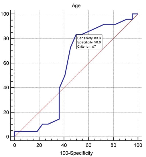 ROC curve for age as a continuous variable. The age cut-off value was ≤7 with area under the curve, sensitivity and specificity of 0.566, 83.3% and 50%, respectively. The dashed diagonal line corresponds to predictive value no better than chance.
