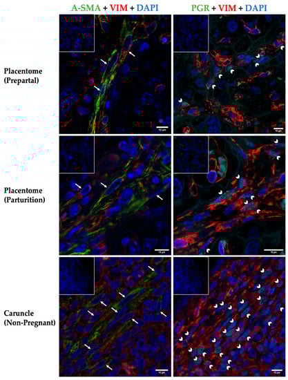 3.1. Immunohistochemical Characteristics of Myofibroblasts in the Bovine Placenta Stroma around Term and in Caruncle Tissue of Non-Pregnant Cows