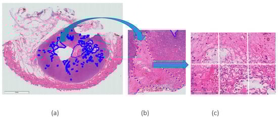 Example of H&E WSI with (a) a few annotations of necrosis marked by expert pathologists, (b) a magnified (magnification 5×) region of agreement of both pathologists and (c) an example of patches extracted from the annotated region (magnification 20×).