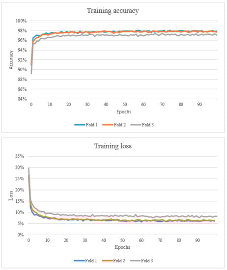 Furthermore, from the data presented in the learning curves, it can be observed that they are generally constant with a decreasing training error and increasing validation accuracy. It can be also noted that the validation loss is nearly constant due to characteristics of validation data, but training loss, which represents the summation of errors in the model, decreases and validation accuracy increases to become constant. This is a desired characteristic in training as it indicates the model is not overfitting the training data.